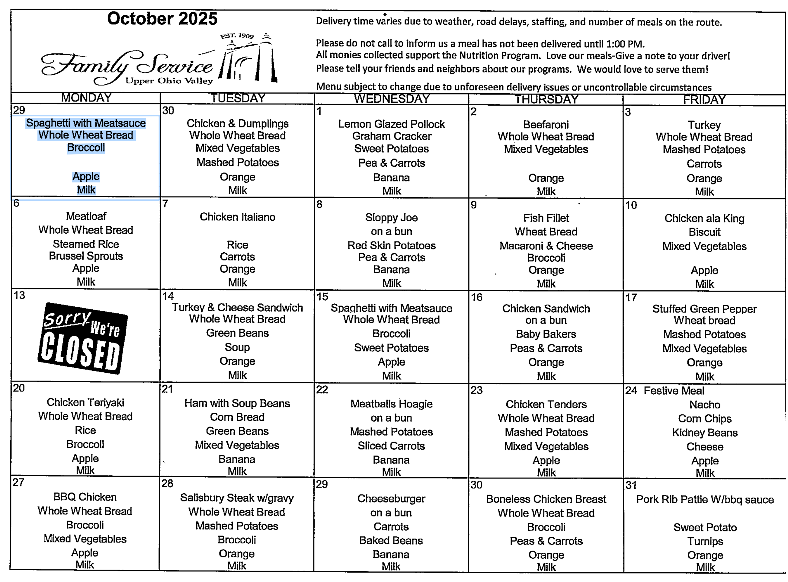 Monthly Menu (October 2025)